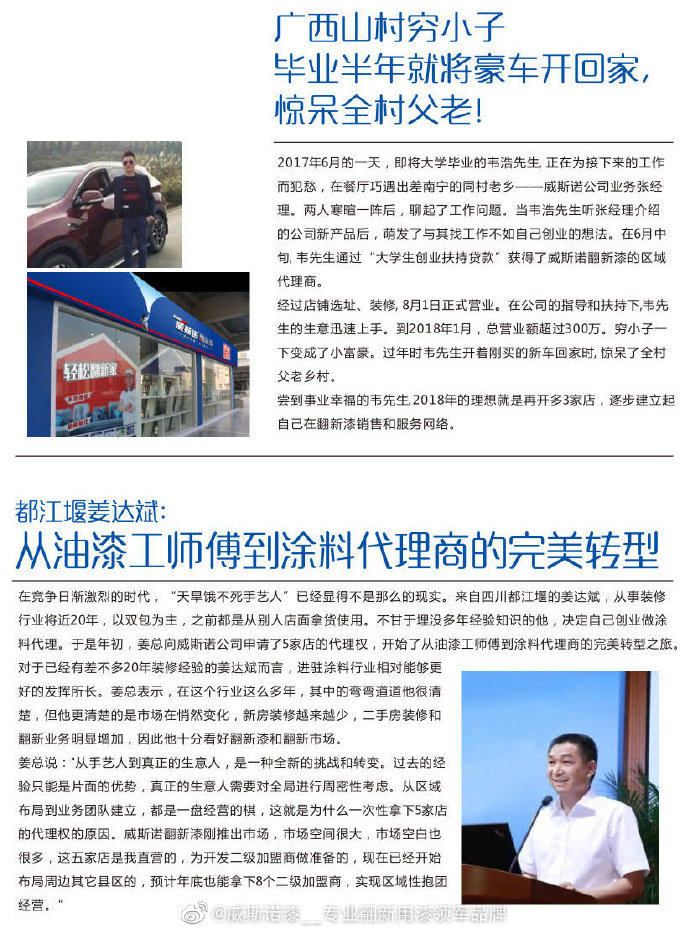 威斯諾漆有技術(shù)、有資源、有經(jīng)驗、有指導,加盟威斯諾漆有優(yōu)勢、有支持、有流程、有案例!還等什么?那就快來加盟威斯諾,共同創(chuàng)造幸福事業(yè)!