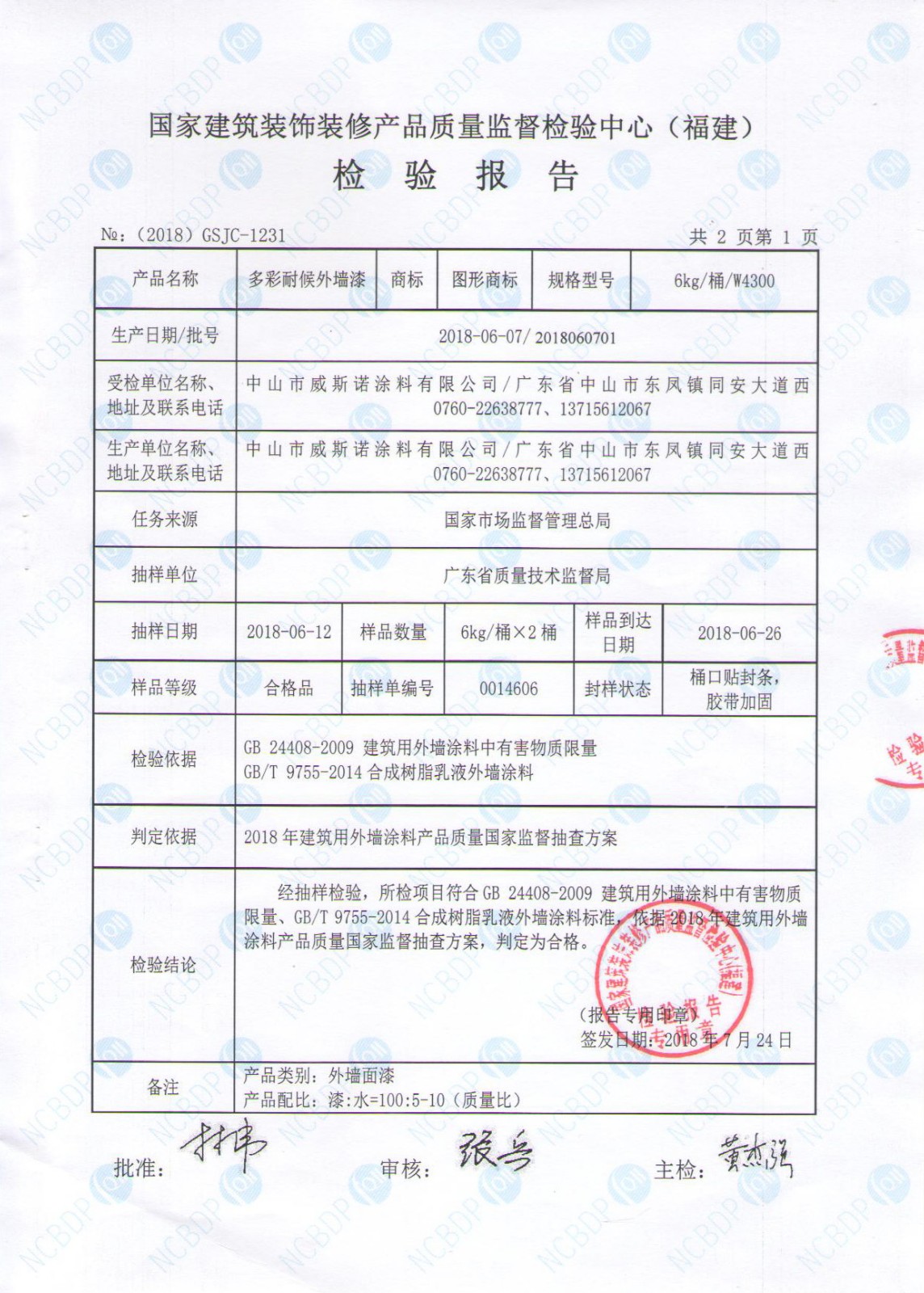 2018年國家市場監(jiān)督管理總局對我司生產(chǎn)建筑用外墻漆產(chǎn)品【多彩耐候外墻漆6kg/桶/W4300】進(jìn)行抽檢查驗(yàn)。