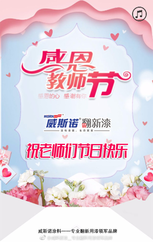 威斯諾翻新漆—祝全天下辛勤的園丁們:教師節(jié)快樂!您就像一位辛勤的園丁,我們就像您培植的小樹,我們?cè)冈诙鞛槟謸鹾?,春天帶給您綠意,夏天帶給您涼爽,秋天帶給您碩果。教師節(jié)到了,請(qǐng)收下誠摯地祝福,愿您身體康健,永遠(yuǎn)幸福吉祥!教師節(jié),難忘師恩。值此教師節(jié)來臨之際,向所有的老師們說一聲:老師,您辛苦了!祝:所有老師節(jié)日快樂! 感謝關(guān)注威斯諾翻新漆!