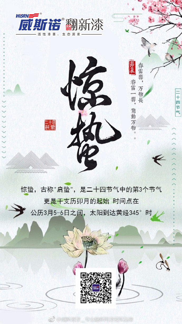 威斯諾翻新漆——驚蟄節(jié)“春雷響,萬物長” 驚蟄,是24節(jié)氣中的第三個(gè)節(jié)氣。每年3月5日或6日,太陽到達(dá)黃經(jīng)345度時(shí)為“驚蟄”。2018年驚蟄是2018年3月5日23時(shí)28分06秒,“驚”為驚醒,“蜇”為蟄伏,“驚蟄”就是驚醒入冬藏伏在土中冬眠的動(dòng)物,《月令七十二候集解》:“二月節(jié)……萬物出乎震,震為雷,故曰驚蟄,是蟄蟲驚而出走矣?!?/span> “春雷響,萬物長”,驚蟄時(shí)節(jié)正是大好的“九九”艷陽天,氣溫回升,雨水增多。驚蟄時(shí)節(jié),我國有些地區(qū)已是桃花紅、李花白,黃鶯鳴叫、燕飛來的時(shí)節(jié),大部分地區(qū)都已進(jìn)入春耕季節(jié)。有諺語云:“驚蟄過,暖和和,蛤蟆老角唱山歌。所以中國勞動(dòng)人民自古很重視驚蟄節(jié)氣,把它視為春耕開始的日子。 感謝關(guān)注威斯諾翻新漆! 招商熱線:4008866938 ![]() ![]() |