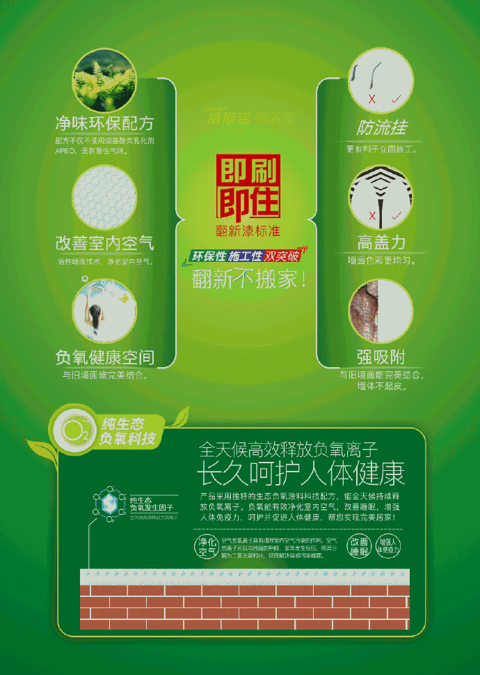 威斯諾——新森家硅藻抗甲醛內(nèi)墻翻新水漆專為室內(nèi)墻面翻新而開發(fā)的專用產(chǎn)品之一。產(chǎn)品以“即刷即住”翻新漆配方技術(shù)為核心,結(jié)合先進(jìn)的制漆工藝生產(chǎn)而成。產(chǎn)品具有良好的施工寬容度,其遮蓋力和流平性佳,能讓墻面翻新更輕松。同時,產(chǎn)品采用獨特的生態(tài)負(fù)氧涂料科技配方,能全天候持續(xù)釋放負(fù)氧離子,負(fù)氧能有效凈化室內(nèi)空氣,改善睡眠,增強(qiáng)人體免疫力,呵護(hù)并促進(jìn)人體健康,幫您實現(xiàn)完美家居!感謝關(guān)注威斯諾翻新漆!