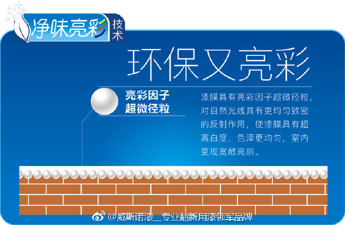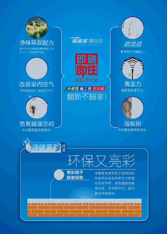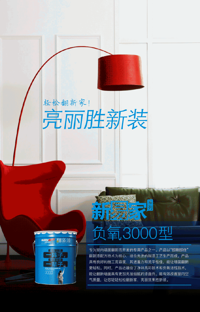 專為室內(nèi)墻面翻新而開發(fā)的專用產(chǎn)品之一。產(chǎn)品以“即刷即住”翻新漆配方技術(shù)為核心,結(jié)合先進(jìn)的制漆工藝生產(chǎn)而成。產(chǎn)品具有良好的施工寬容度,其遮蓋力和流平性佳,能讓墻面翻新更輕松。同時,產(chǎn)品還融合了凈味亮彩技術(shù)和負(fù)氧活性技術(shù),漆膜具有亮彩因子超微經(jīng)粒,對自然光線具有更均勻致密的反射作用,使漆膜具有超亮白度,色澤更均勻,室內(nèi)更現(xiàn)寬敞亮麗。能讓翻新墻面具有更加亮麗細(xì)膩的漆面外,能有效改善室內(nèi)空氣質(zhì)量,讓您輕輕松松翻新家,亮麗效果勝新裝。