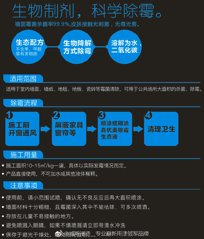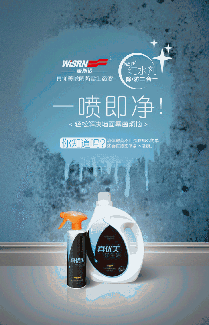 “真優(yōu)美”除菌防霉生態(tài)液產品,采用高科技的新一代除霉配方,內含多種除霉因子,對霉菌進行迅速分解。純水劑,除/防二合一,安全環(huán)保。10-30分鐘快速見效,輕松解決墻面霉菌煩惱。