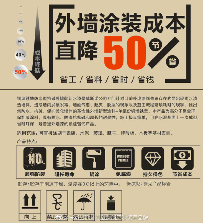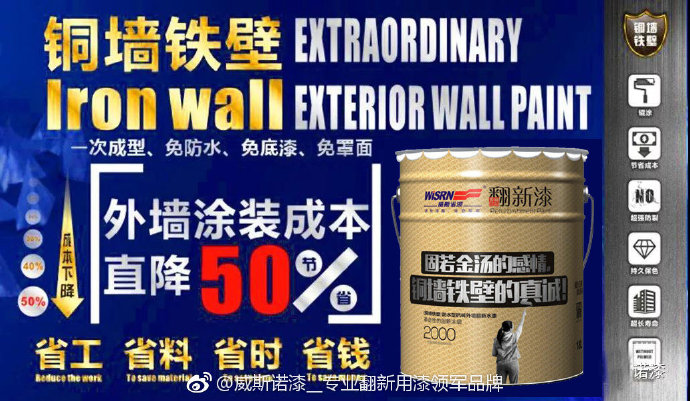 “銅墻鐵壁”防水型抗堿外墻翻新水漆,主要優(yōu)勢特點:超強防裂、超長壽命、免底漆、輥涂、持久保色、節(jié)省成本。