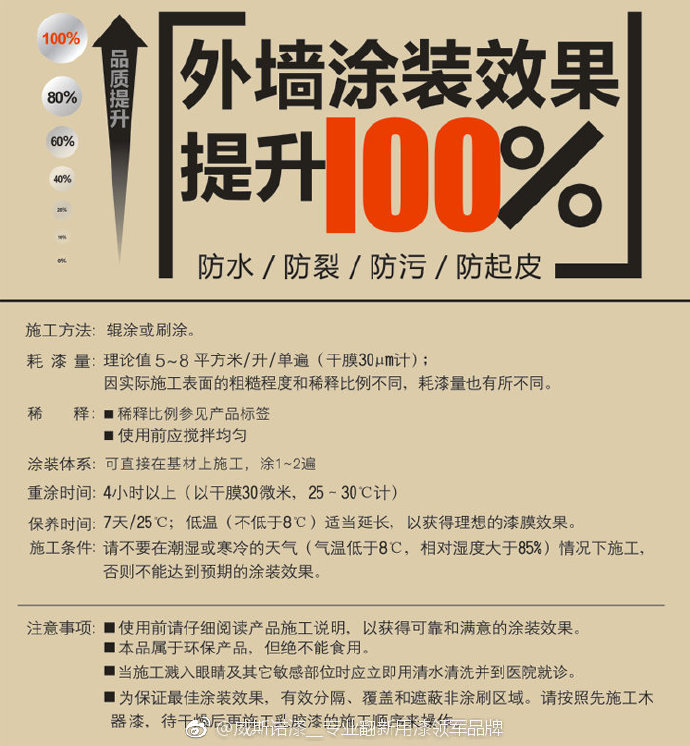 本產(chǎn)品為高分子聚合環(huán)保乳液涂料,具有防水、防滲抗鹽堿和超長的耐候性,施工極其簡單,可在水泥基面上一次成型,省時環(huán)保,是普通外墻漆的最佳代產(chǎn)品。
