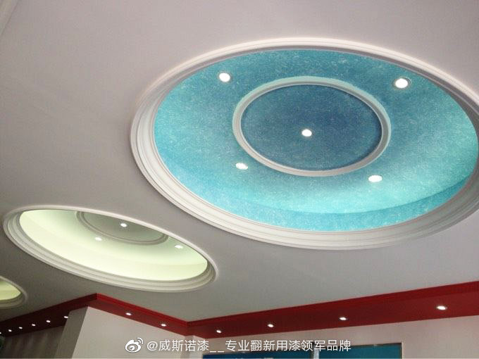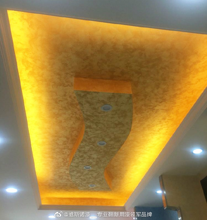 天花吊頂藝術(shù)漆效果,它通過特殊的涂裝工藝、專用的模具,在上做出風(fēng)格各異的紋理、質(zhì)感、圖案,并擁有奇幻的折光映射效果,乳膠漆和藝術(shù)漆結(jié)合使用。
