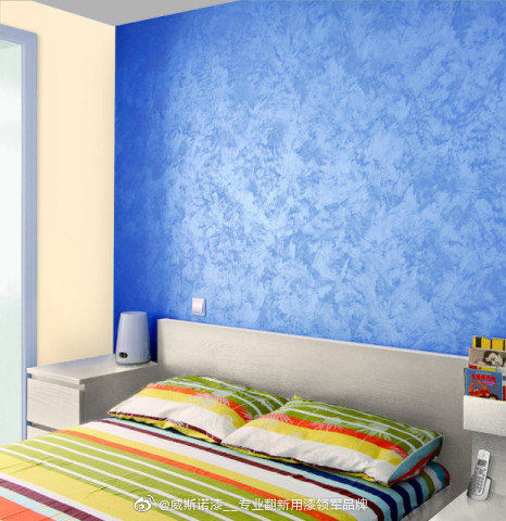 臥室床頭背景墻藝術漆效果,可通過特殊的涂裝工藝、專用的模具,在上做出風格各異的紋理、質感、圖案,并擁有奇幻的折光映射效果,乳膠漆和藝術漆結合使用。
