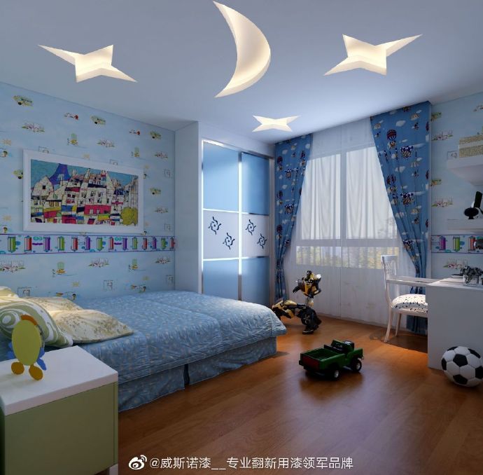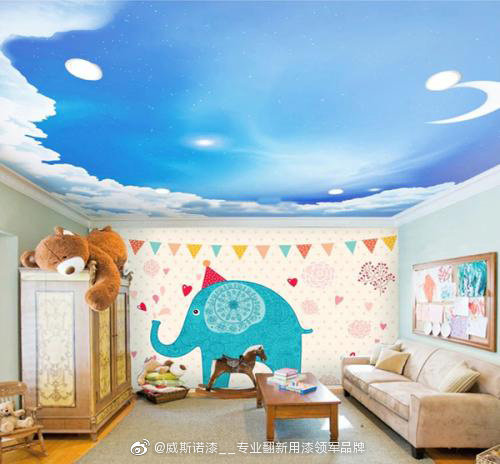 兒童房天花吊頂藝術(shù)漆效果,藍(lán)天白云、夜晚星空等,它通過特殊的涂裝工藝、專用的模具,在上做出風(fēng)格各異的紋理、質(zhì)感、圖案,并擁有奇幻的折光映射效果,乳膠漆和藝術(shù)漆結(jié)合使用。