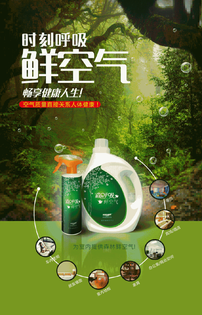 森呼吸負(fù)氧生態(tài)液對(duì)家庭住房、賓館、酒店、營業(yè)場(chǎng)所,空氣質(zhì)量較差的室內(nèi)使用,能有效釋放負(fù)氧離子,改善空氣,讓你置身于森林中。